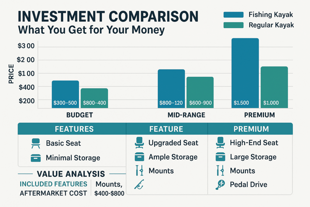 - Price reflects purpose: Expect to pay 30-50% more for a fishing kayak, but the specialized features often justify the cost