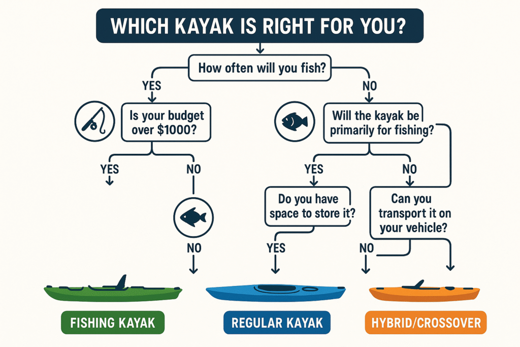- 60-89% fishing → Fishing kayak or high-end hybrid