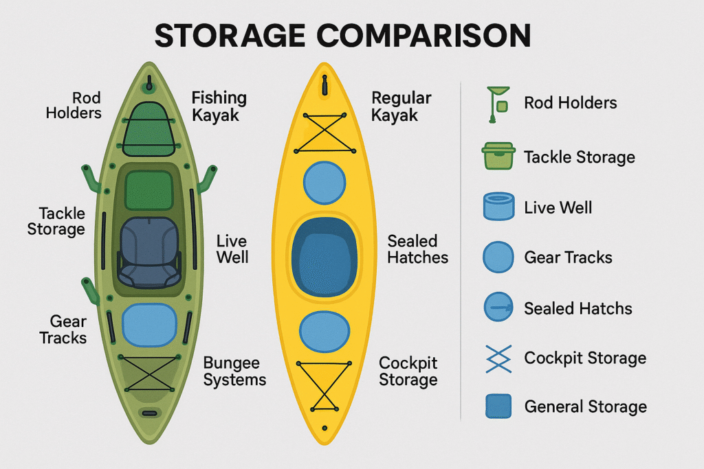 | Storage | Specialized – Rod holders, tackle compartments, gear tracks | Basic – Sealed hatches, deck bungees |