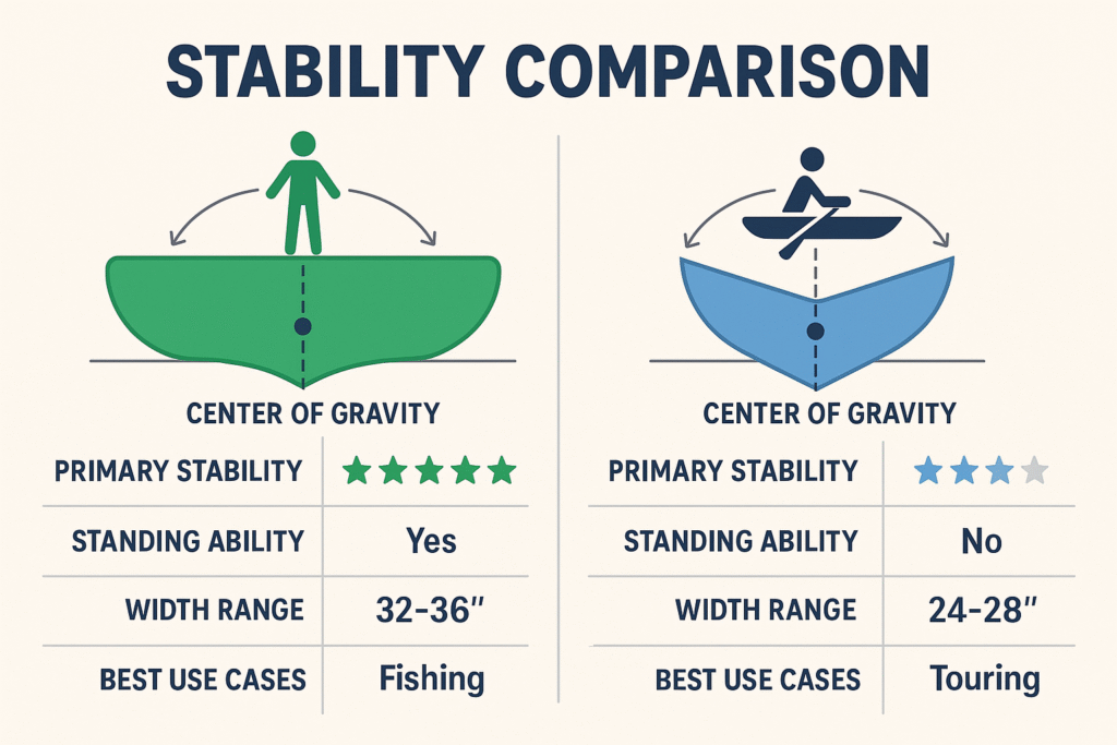 | Stability | Excellent – Wide beam (32-36″), flat hull design | Good – Narrower V-shaped hull, less stable at rest |